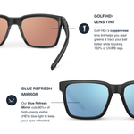 Golf HD+ has a copper-rose lens tint (what you see when you are wearing them) and features our Blue Refresh Mirror on the front to cut HEV light and give the lenses our signature blue look.